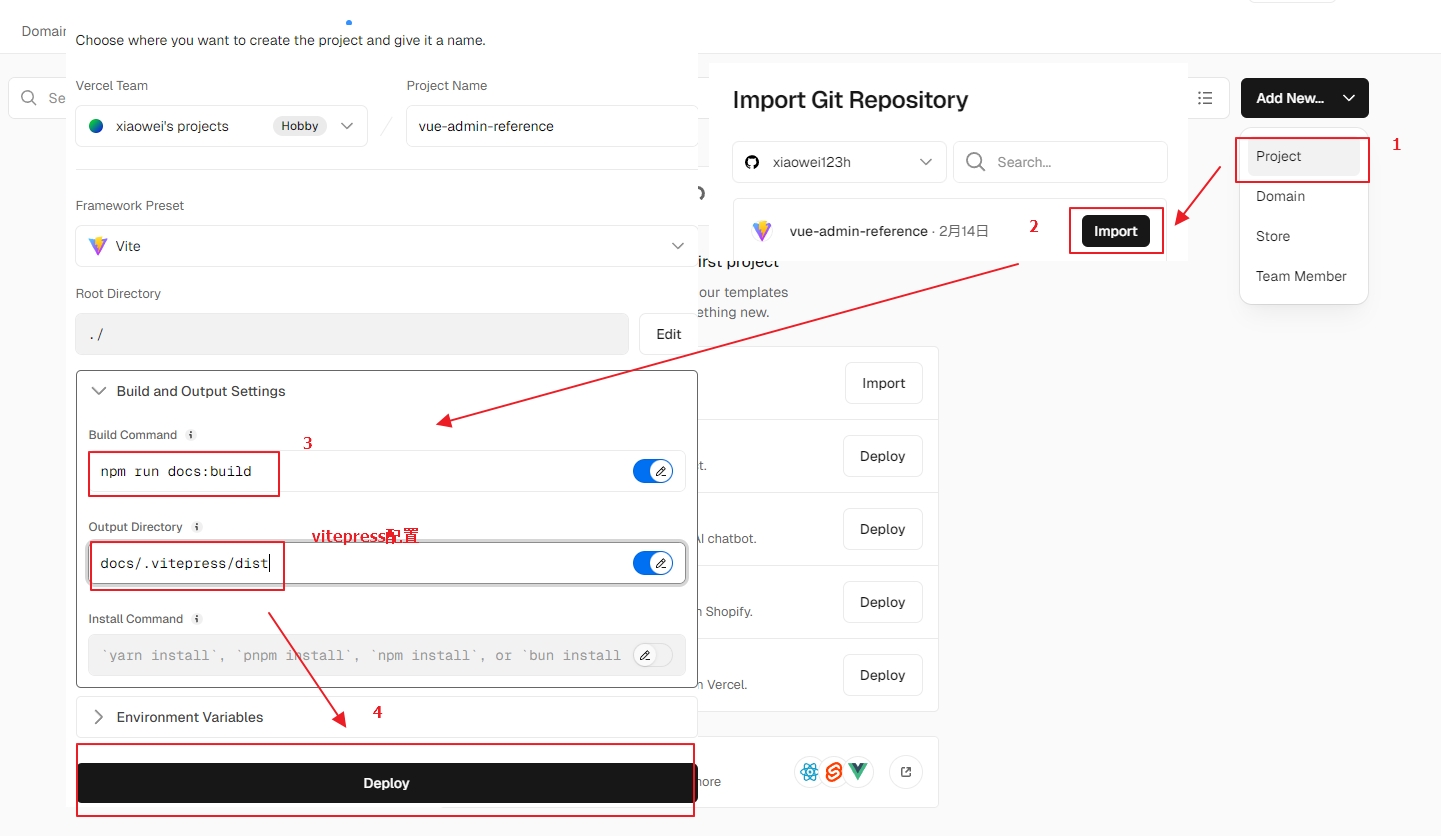 进入Vercel官网,注册用户,用github(或其他)关联,按如下图片顺序
